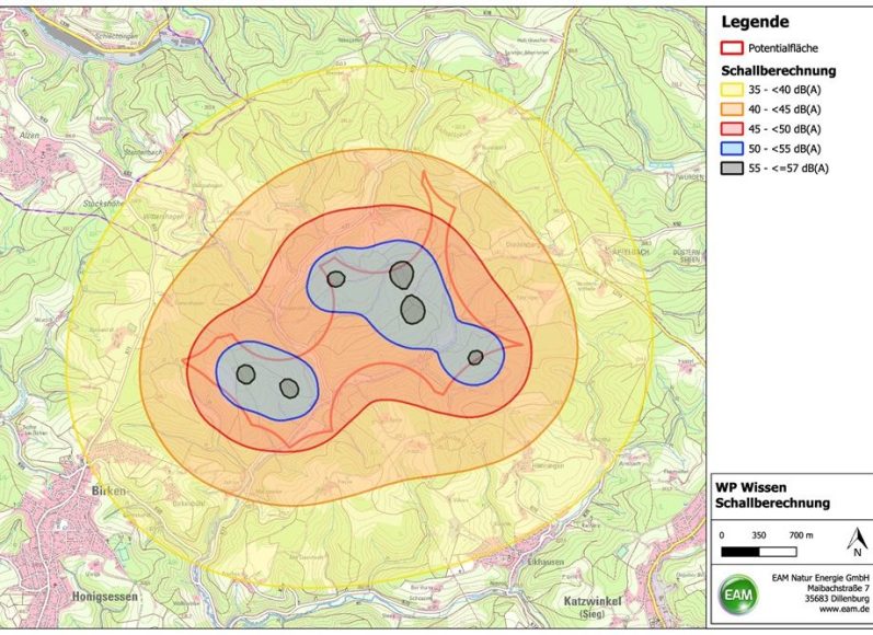 Für den geplanten Windpark „Sechsmorgen“ haben wir hierzu eine Karte erstellt, die die entsprechenden Werte darstellt und aufzeigt welche Orte betroffen sind. Orte, für welche mit Schallwerten über den Grenzwerten zu rechnen ist, werden durch die Drosselung der Anlagen entlastet.