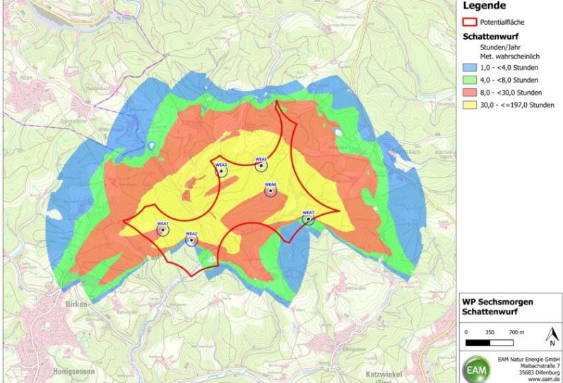 Für den geplanten Windpark „Sechsmorgen“ haben wir hierzu eine Karte erstellt, die die entsprechenden Werte darstellt und aufzeigt welche Orte betroffen sind. Orte, für welche mit Schallwerten über den Grenzwerten zu rechnen ist, werden durch die Drosselung der Anlagen entlastet.