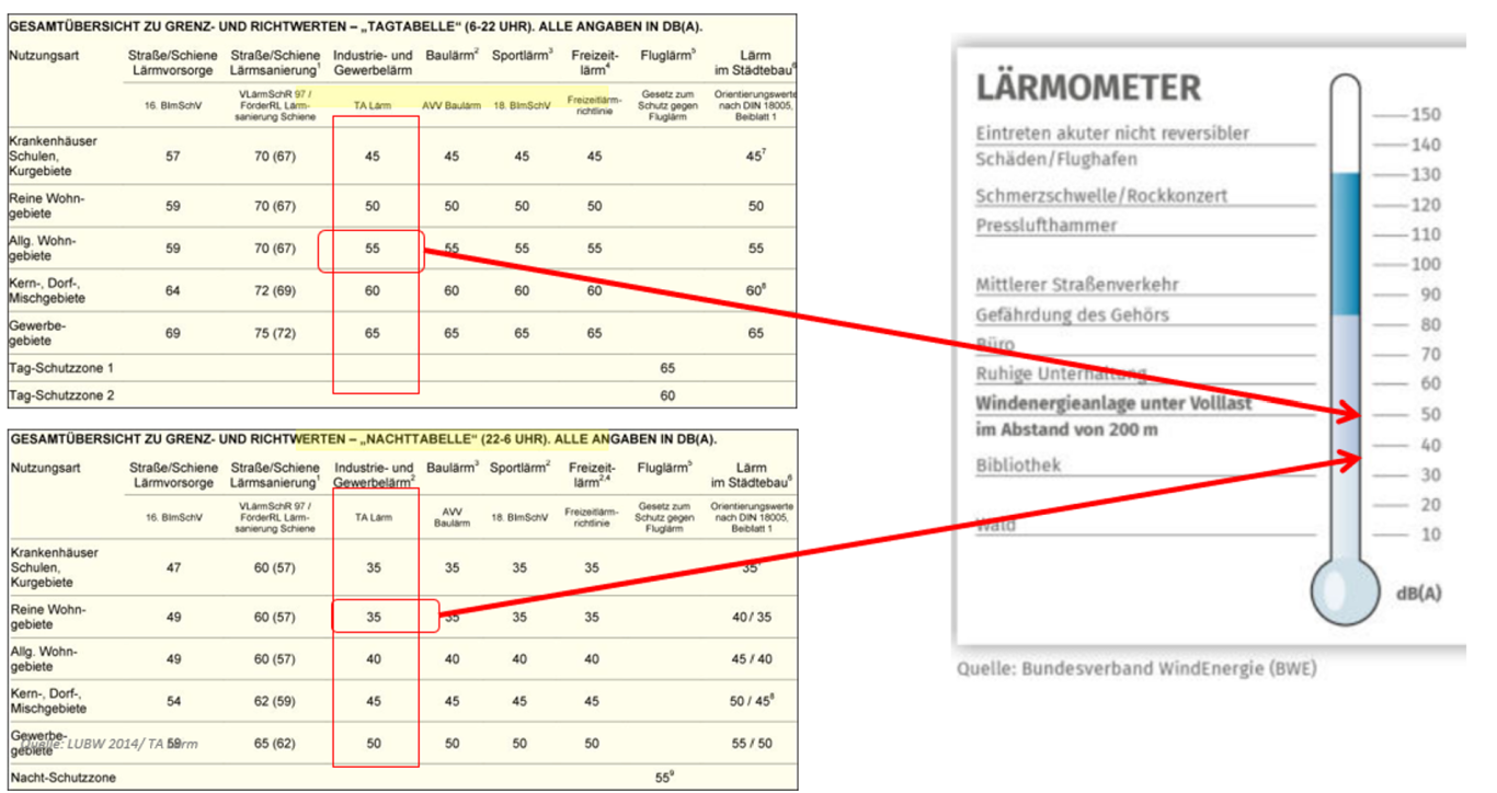 Grundsätzlich verursacht eine Windenergieanlage Geräusche in verschiedenen Frequenzbereichen. Damit die Geräusche nicht zur Belastung für Anwohnende werden, müssen bestimmte Grenzwerte eingehalten werden, die durch die Technische Anleitung zum Schutz gegen Lärm (inkludiert im Bundes-Immissionsschutzgesetz) vorgegeben sind. In der untenstehenden Grafik ist zu sehen, wie die Lärmwerte der Windkraftanlagen einzuordnen sind. Oberstes Kriterium hierbei ist, das die gemessenen Immissionswerte an den jeweiligen Orten nicht überschritten werden.